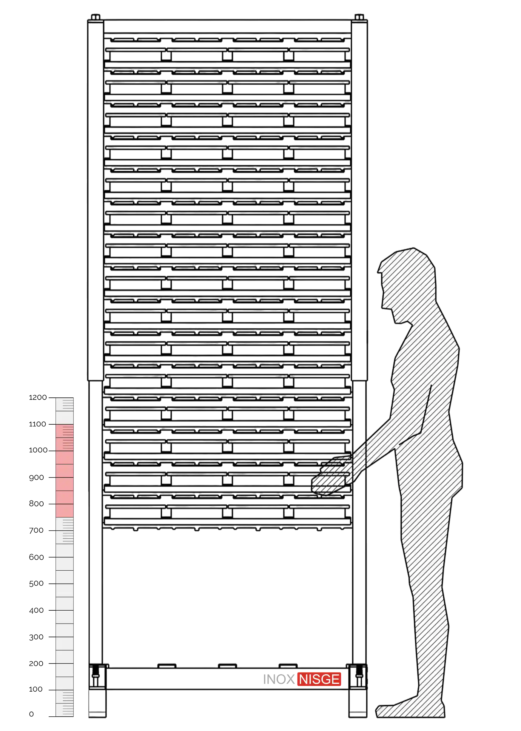 El innovador diseño del sistema multimolde INOXNISGE representa un avance significativo en la ergonomía operativa para procesos industriales de carga y descarga manual. Este sistema está específicamente diseñado para que el operador pueda manipular los moldes dentro de la franja de altura ergonómica óptima (entre 750 y 1100mm), adaptándose a las recomendaciones internacionales según el peso a manipular.