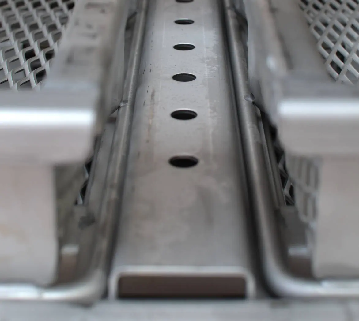 Los soportes de perfil omega perforado instalados para sostener las tapas de cada nivel cumplen una doble función esencial: proporcionan la resistencia mecánica necesaria mientras facilitan el flujo de aire a través del canal del perfil y mediante los múltiples orificios distribuidos estratégicamente a lo largo de toda la estructura de soporte. Este diseño innovador permite que el aire caliente y/o el humo durante los procesos de cocción y/o ahumado alcancen eficazmente las zonas más internas de los moldes, incluso cuando la jaula se encuentra completamente cerrada y compactada.